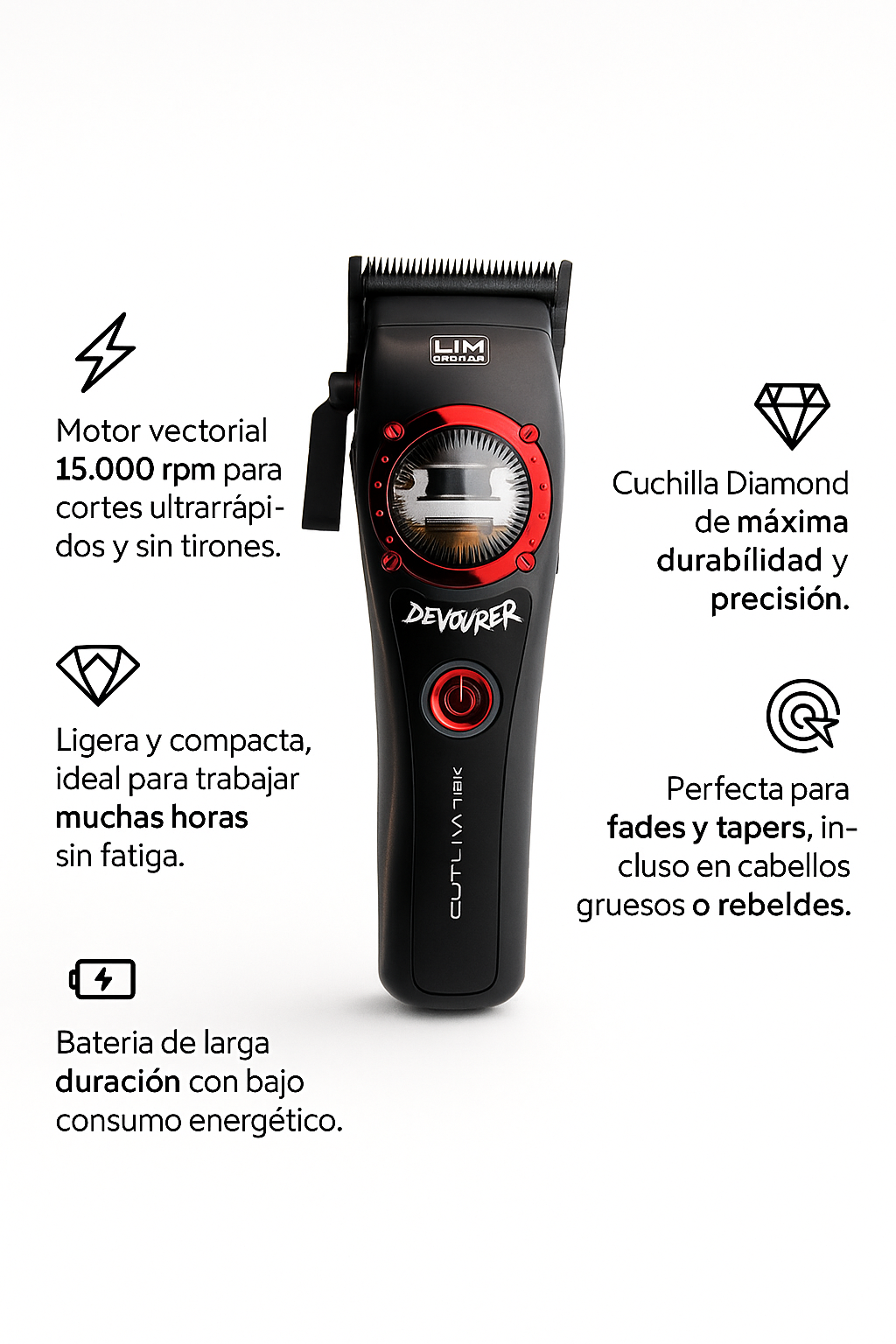 La Devourer CUTLIM 15K es una máquina diseñada para auténticos profesionales: barberos, estilistas y creadores de estilo que buscan una herramienta capaz de seguir su ritmo sin perder precisión.