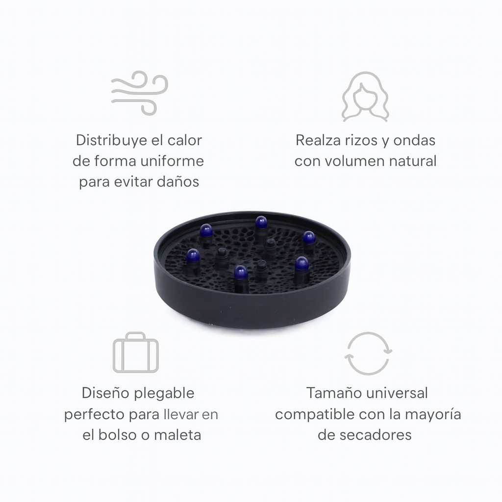 Potencia tu secado con el Difusor Steinhart Universal Plegable. Ideal para definir rizos, proteger el cabello y distribuir el calor de forma uniforme. Su diseño plegable y de silicona lo hace compacto, ligero y perfecto para viajar.