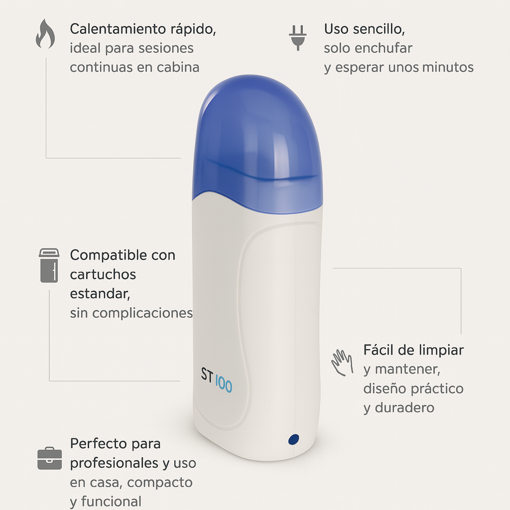 El fundidor ST-100 es el aliado perfecto para una depilación profesional con cera roll-on. Calienta de forma rápida, segura y uniforme, asegurando una textura ideal para aplicar sin tirones ni esperas.