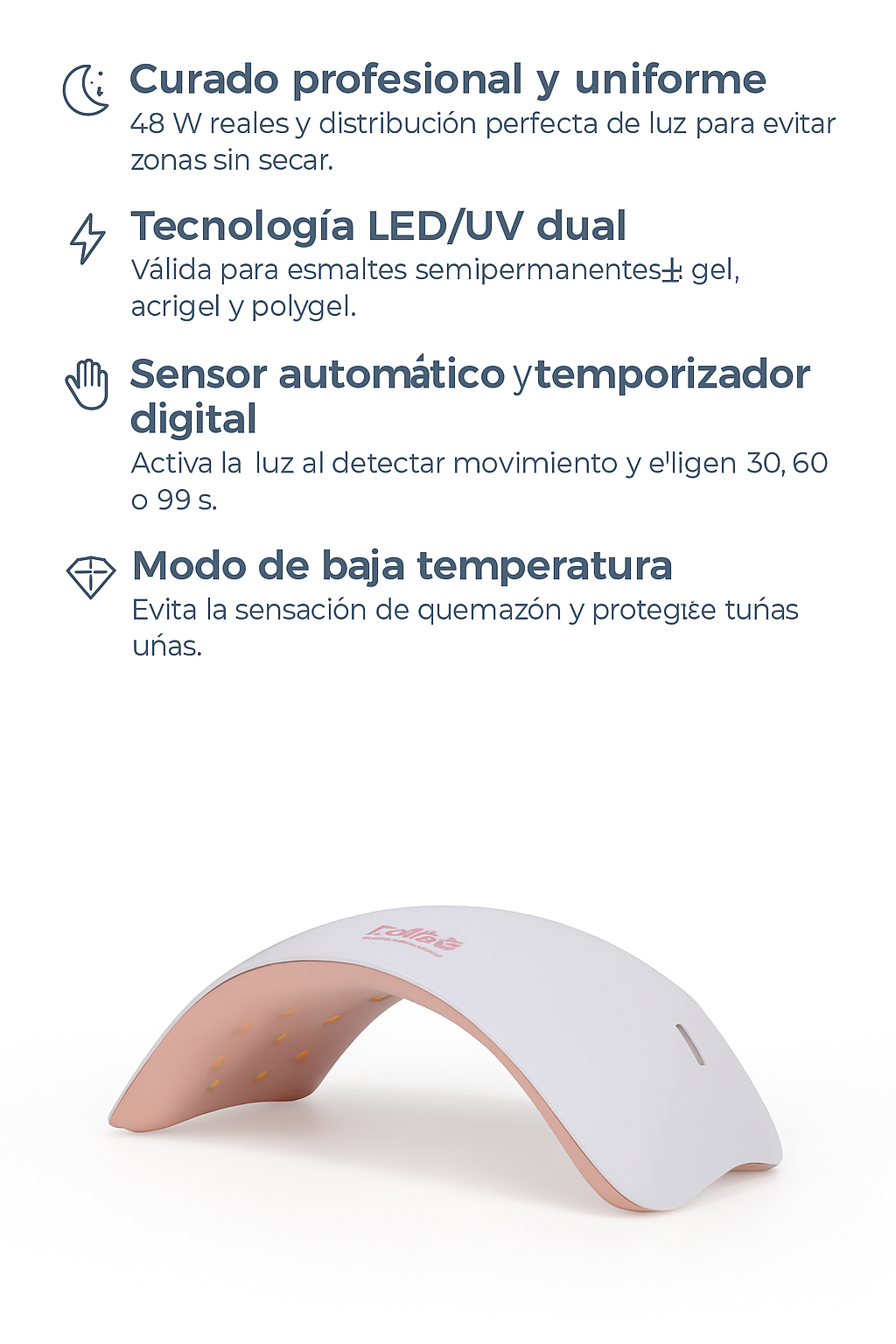 🌙 Curado profesional y uniforme: 48 W reales y distribución perfecta de luz para evitar zonas sin secar.