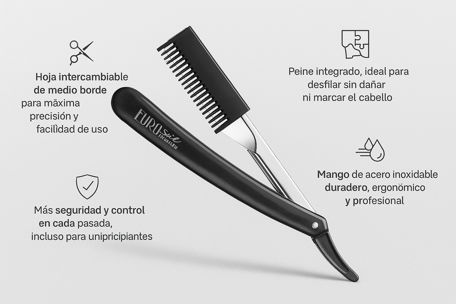 Tanto si trabajas en barbería como en peluquería, esta navaja Eurostil de hoja cambiable con peine incorporado es tu aliada perfecta para lograr resultados limpios, seguros y estilizados.