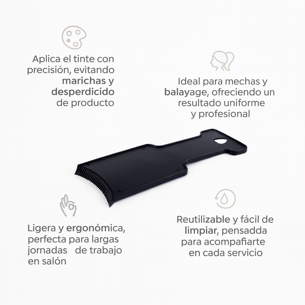 Domina la coloración con máxima precisión gracias a esta paleta con peine integrado, diseñada para facilitar mechas, balayage y trabajos técnicos de color. Ligera, resistente y cómoda para uso profesional y en casa.