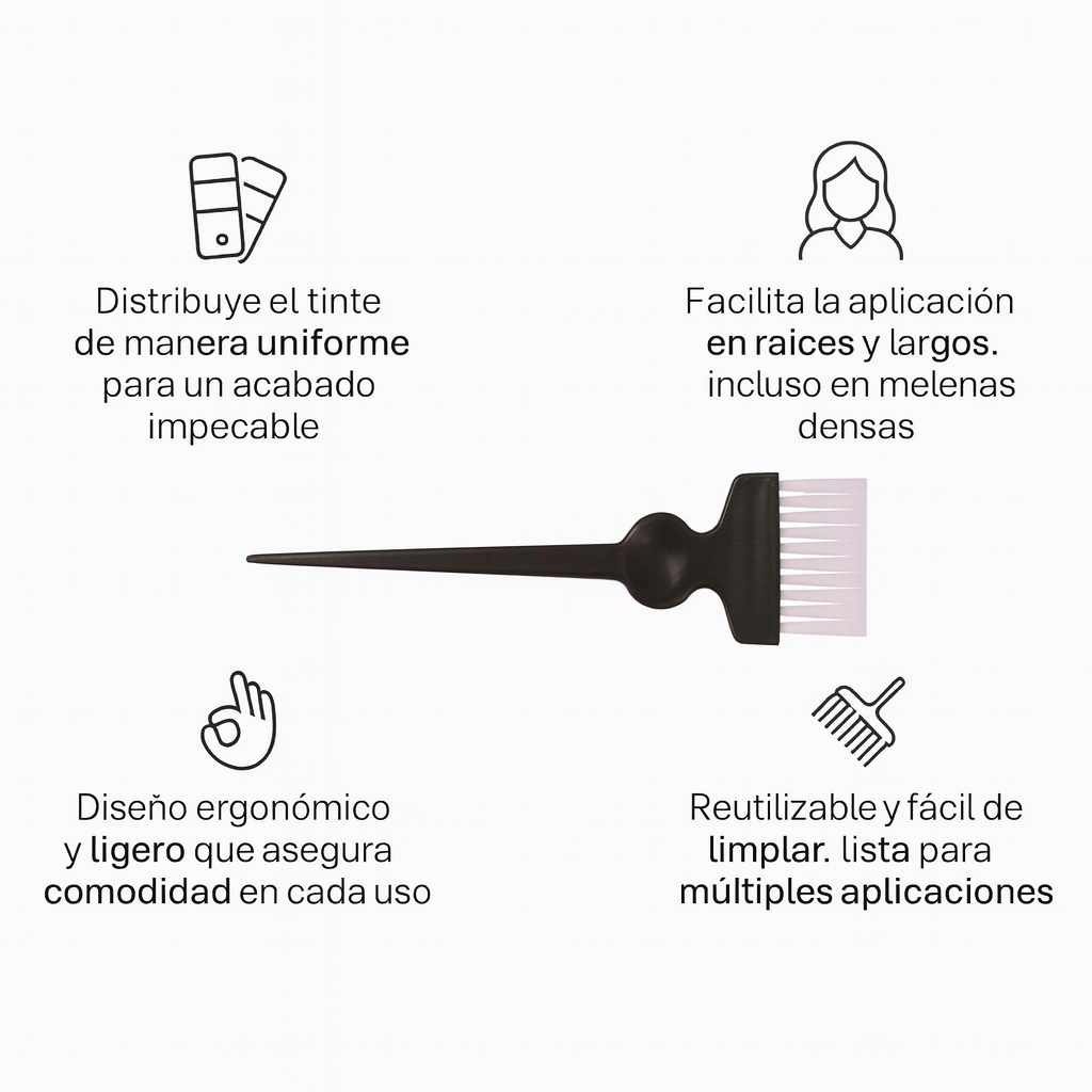 Su mango ergonómico facilita el agarre y el control, haciendo que el proceso sea más cómodo incluso en trabajos prolongados. Además, está fabricada con materiales duraderos que resisten el contacto con tintes y decolorantes, manteniendo su rendimiento en cada uso.