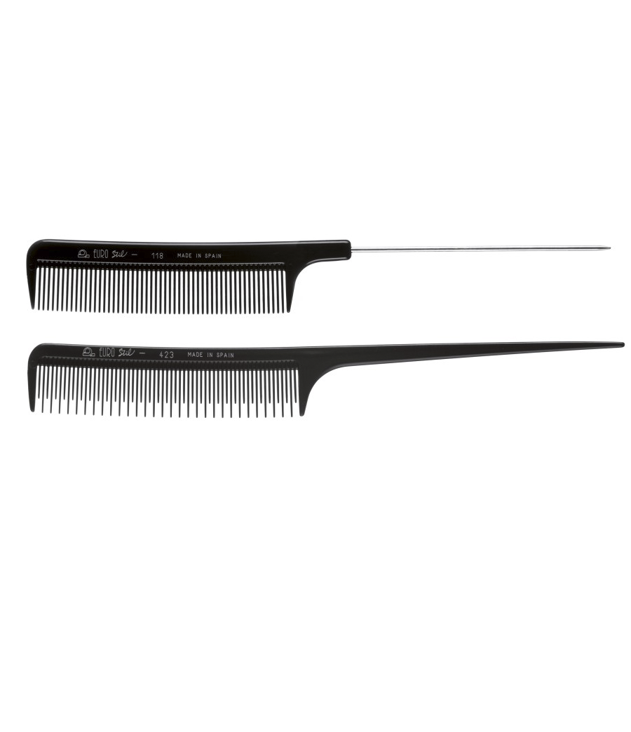 La púa de metal ofrece mayor precisión para trabajos técnicos, mientras que la de plástico es más suave con el cuero cabelludo.