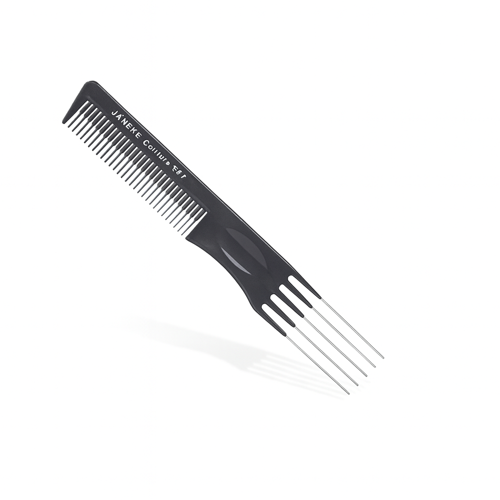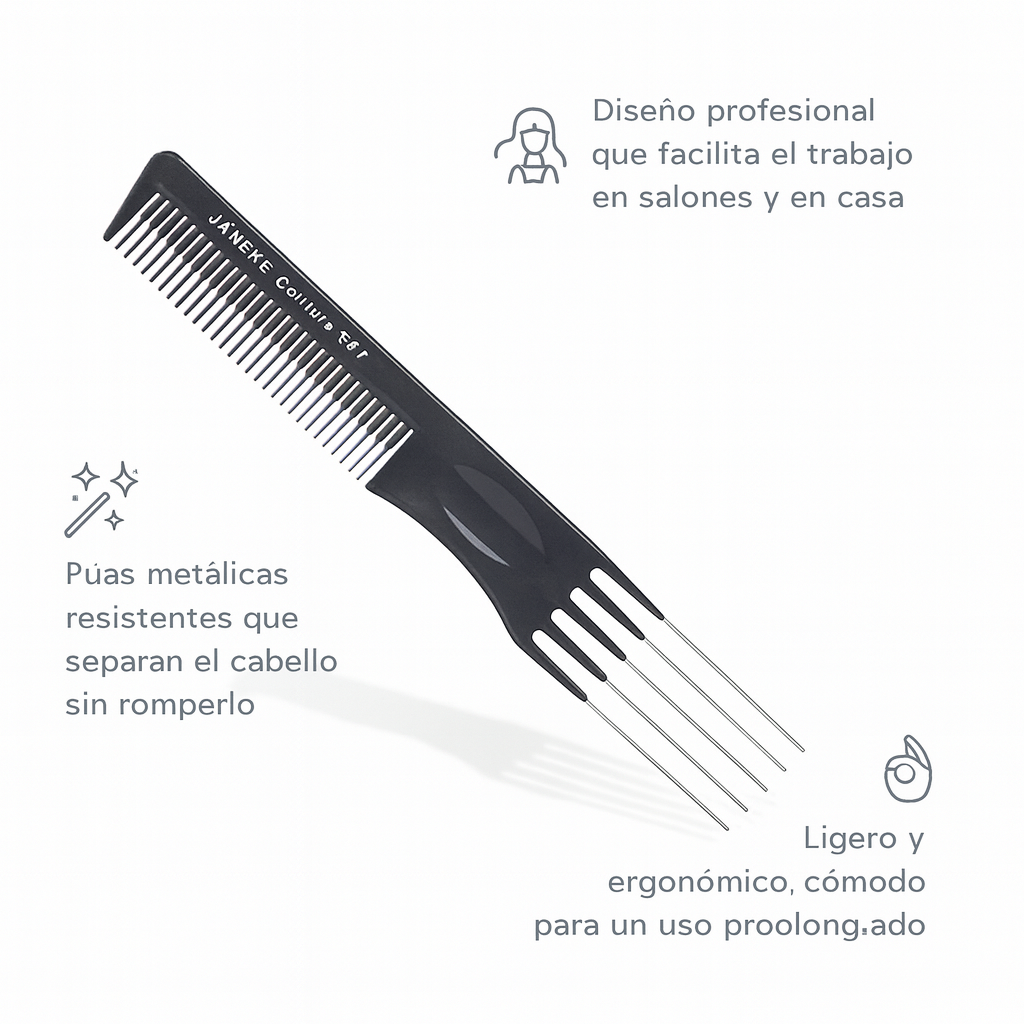 Dale volumen y definición a tu peinado con el Peine Janeke Titanio 877, diseñado con púas metálicas que permiten ahuecar el cabello con precisión sin dañarlo. Ideal tanto para uso profesional como en casa.