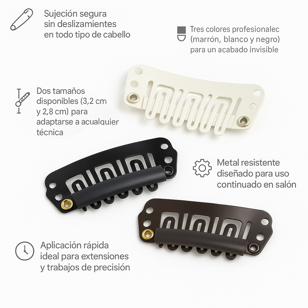 Estas peinetas metálicas son un imprescindible para profesionales y usuarios que buscan máxima precisión al colocar extensiones. Su diseño compacto permite fijar mechones sin aportar volumen y con un acabado totalmente discreto.