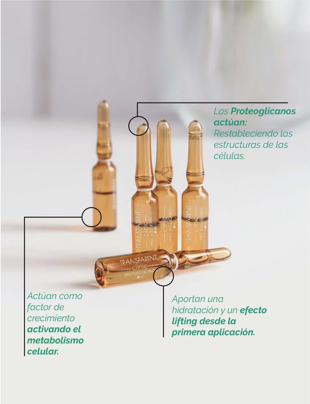 Las ampollas Proteoglicanos + HC están diseñadas para devolver a tu rostro toda la energía, firmeza y luminosidad que pierde con el paso del tiempo o por factores como el estrés, el cansancio o la deshidratación. Gracias a la acción combinada de los proteoglicanos, el ácido hialurónico y la vitamina C, tu piel recupera elasticidad y suavidad desde la primera aplicación.