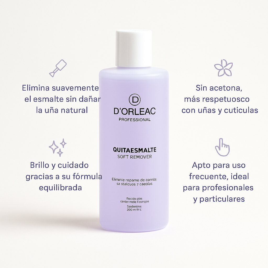 El Quitaesmalte Sin Acetona D’Orleac ha sido creado para quienes buscan una limpieza eficaz pero delicada. Su fórmula sin acetona protege la estructura de la uña natural, evitando la sequedad y la fragilidad que producen los quitaesmaltes convencionales.