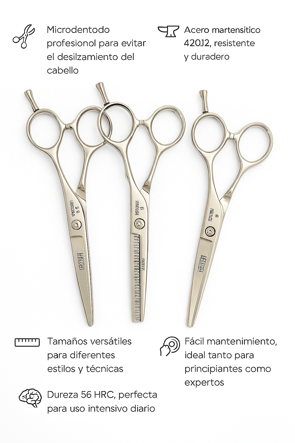 El afilado microdentado sujeta el cabello al cortar, lo que evita que se deslice. Es perfecto para cortes secos, desfilados o texturizados.