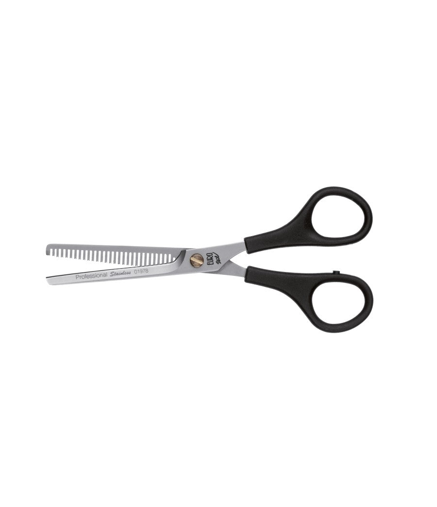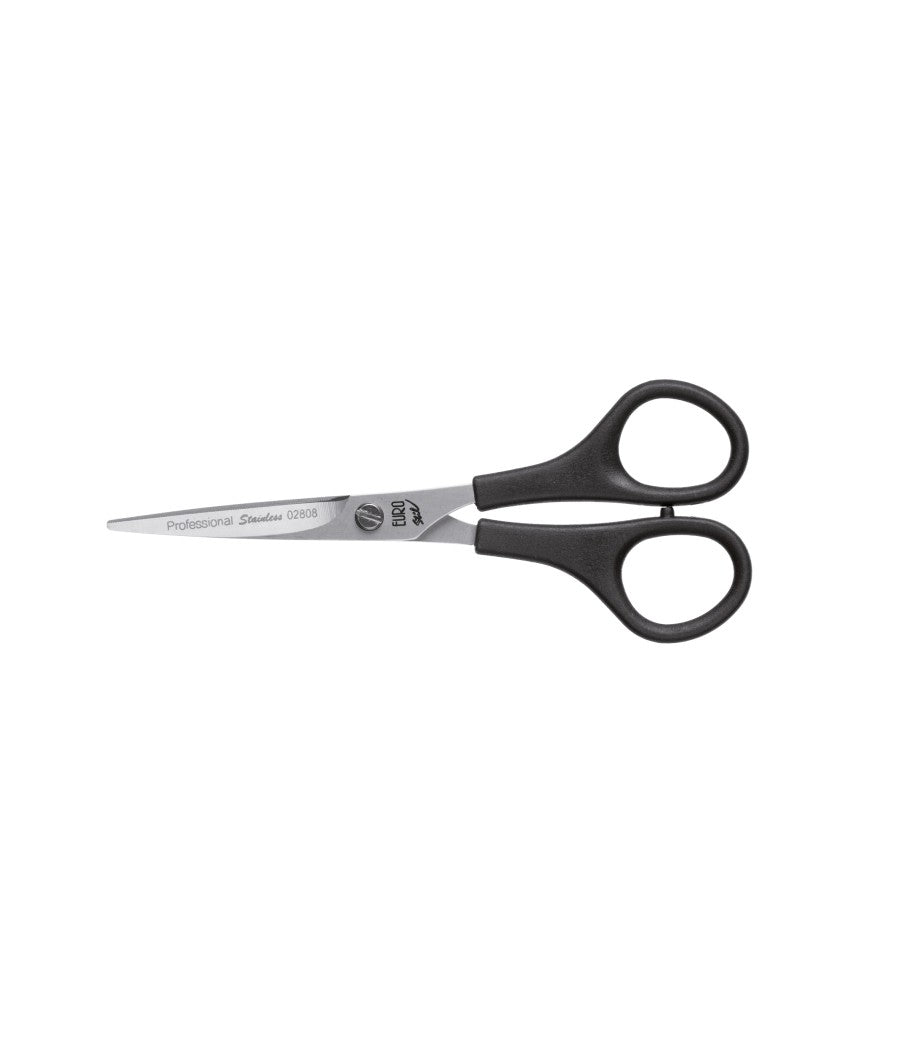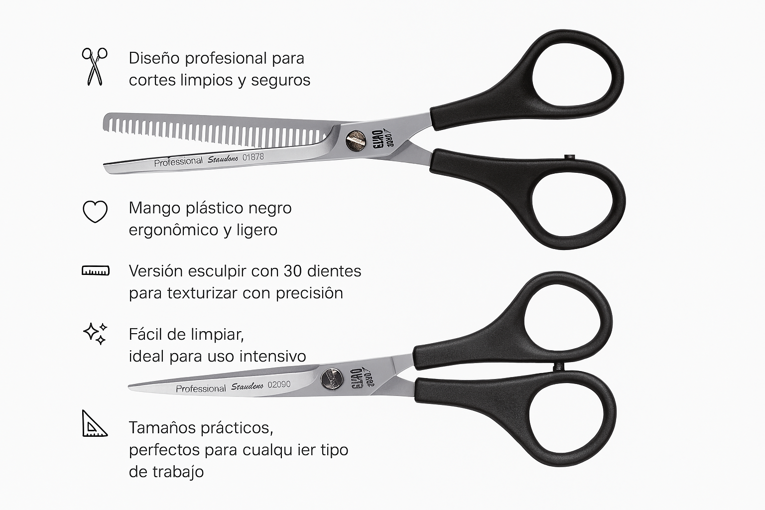 Esta tijera de puño negro es una opción excelente para estilistas que buscan una herramienta funcional, cómoda y eficaz. Su mango ergonómico en plástico negro la hace ligera, fácil de manejar y resistente, ideal tanto para manos expertas como para quienes están empezando en el sector.