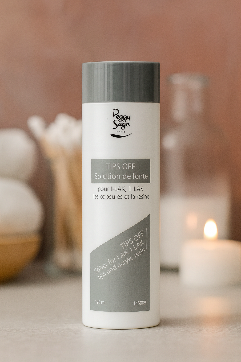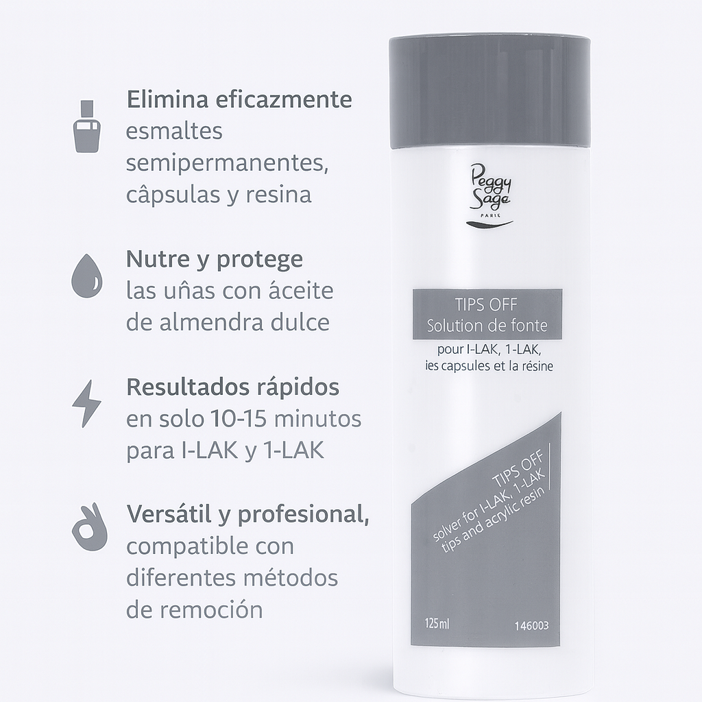 El Tips Off es la solución profesional que elimina fácilmente I-LAK, 1-LAK, cápsulas y resina, mientras cuida tus uñas gracias a su aceite nutritivo de almendra dulce. Una retirada rápida, eficaz y sin dañar la uña natural.